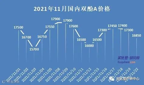 11月国内双酚A市场价格震荡向下,月初价格由17500元/吨短期内跌至15700元/吨,而后提升至17900元/吨后再次下滑至16000元/吨,上周价格再次站上17000元/吨位置后再次跌回16800元/吨,月内市场价格反复震荡。