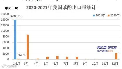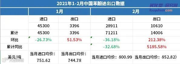 2021年1-2月我国苯酚出口量同比暴增5185%