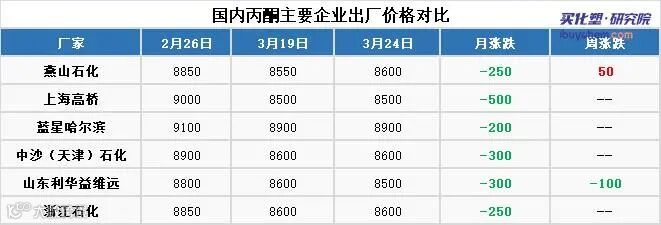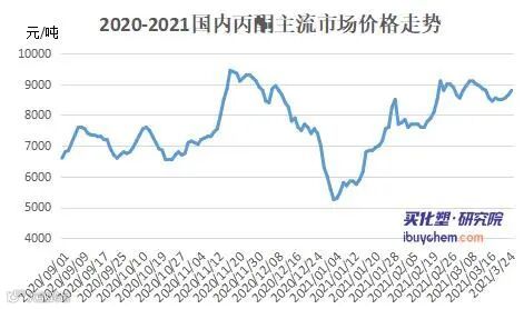 本周,国内丙酮市场受后市供应紧张预期影响,市场价格小幅推高,个别生产企业也小幅提价探市,在一定程度上给与市场心态支撑,截止到3月25日,华东丙酮市场主流价格在8700-8900元/吨;华南市场主流价格在9000-9100元/吨,价格较上周涨幅300元/吨。