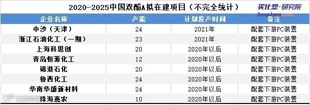 2019年11月,国家发改委印发《产业结构调整指导目录(2019年本)》。“10万吨/年及以上离子交换法双酚A”仍处于鼓励类石化化工项目中。未来五年内,中国双酚A在建及拟建项目产能多达近400万吨。
