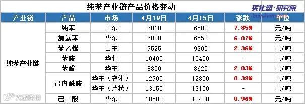 4月19日,中石化纯苯挂牌价上调150元/吨至7000元/吨。底部支撑强劲,市场看涨心态良好,目前山东地炼库存普遍不高,价格跟涨。国内纯苯现货市场价格涨破7000元/吨,其产业链相关产品价格均出现不同程度上涨。