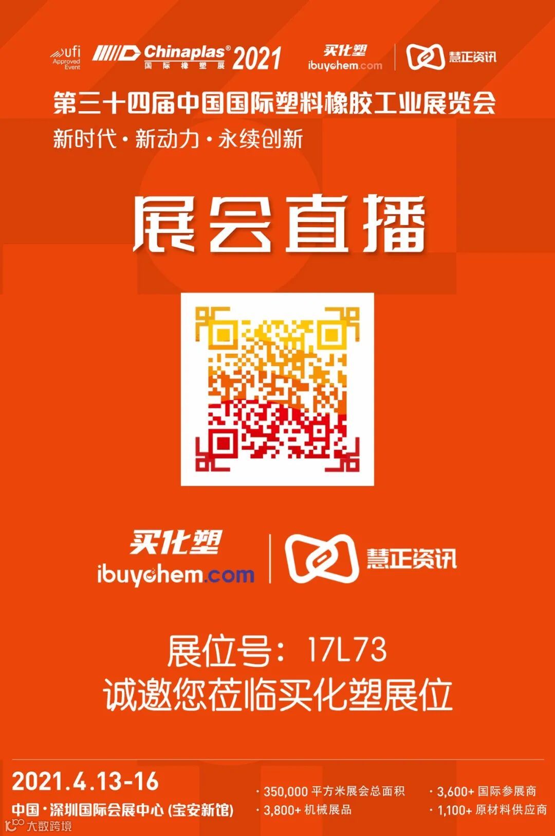 4月13-16日“CHINAPLAS 2021国际橡塑展”在深圳国际会展中心华丽盛大开幕,本次展会以以“新时代·新动力·永续创新”为主题,有逾3,600家展商,将在这里展现他们的新产品、新技术、新创新!在展商中,买化塑的智慧商家格外引人注意,他们利用线下展会与买化塑的慧销通数字化结合,开启智慧营销新模式。