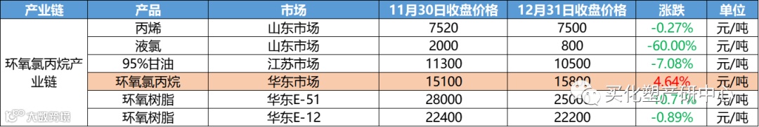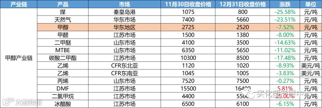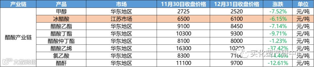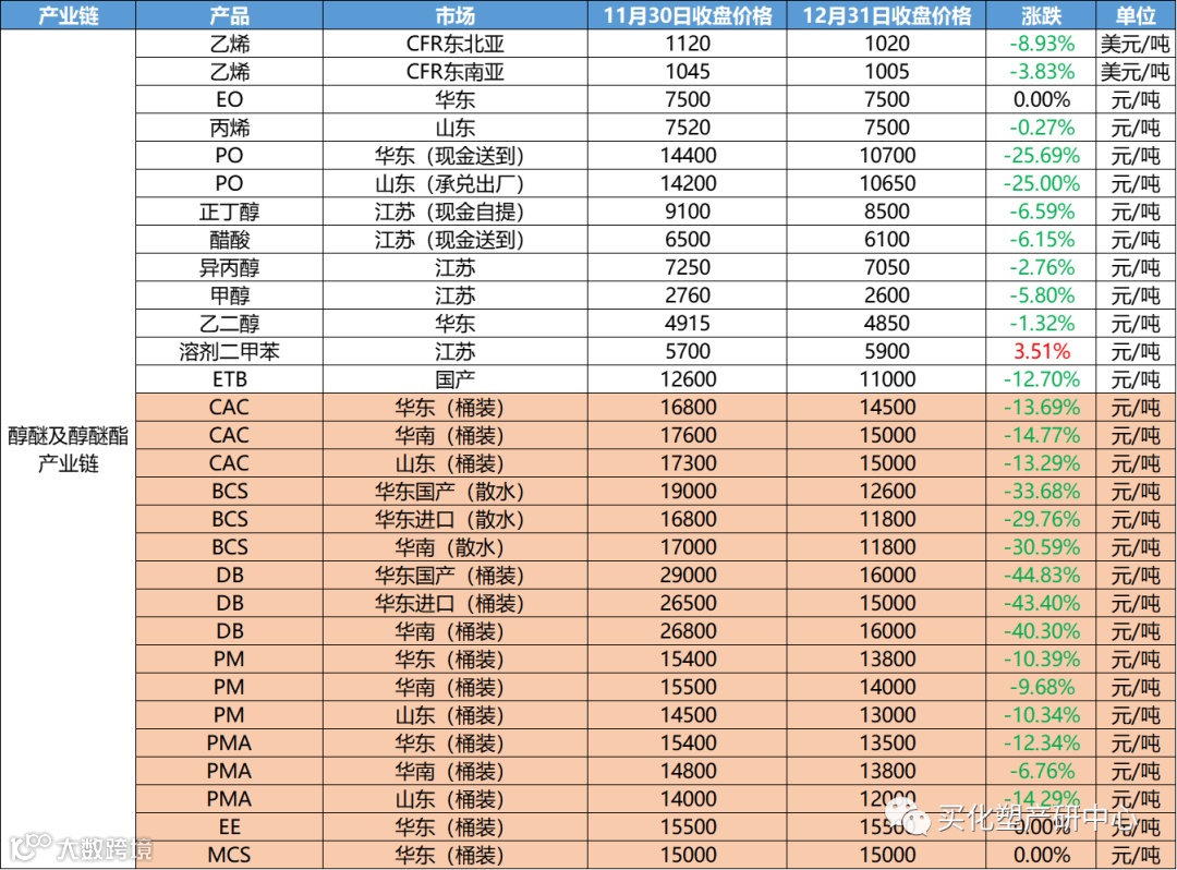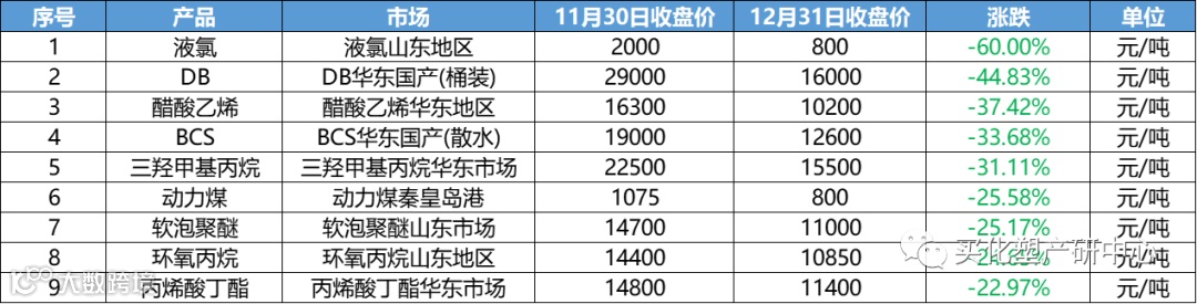 其中跌幅最大的为液氯,下跌幅高达60%;DB跟随其后,下跌44.83%;醋酸乙烯下跌37.42%