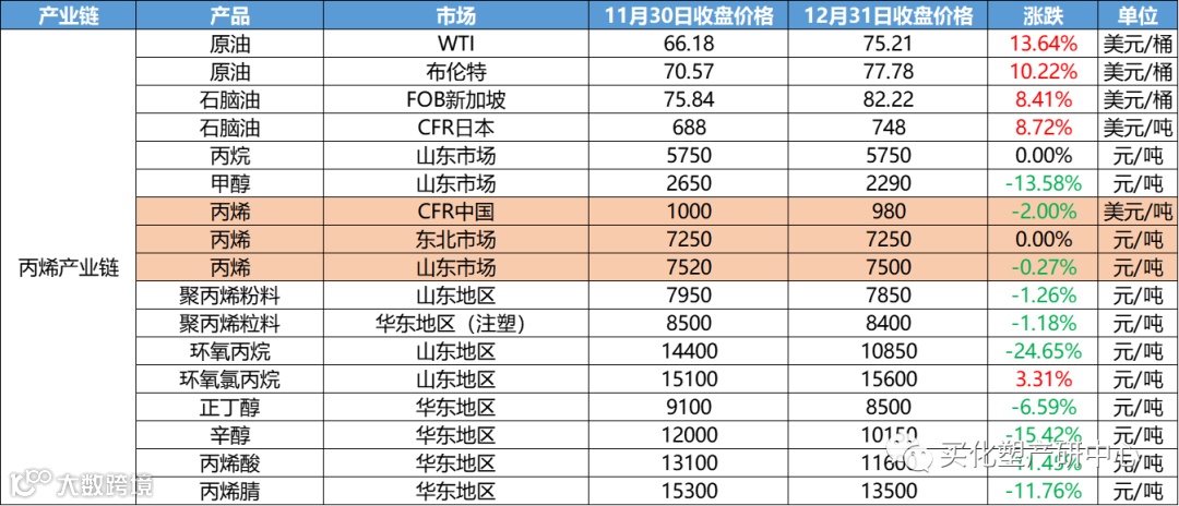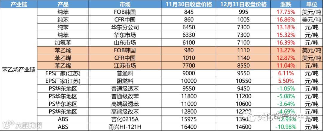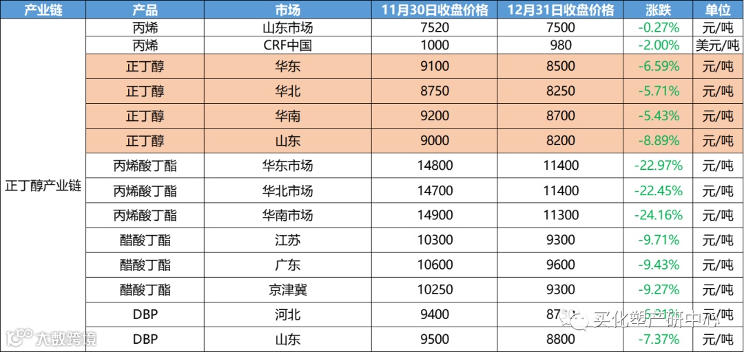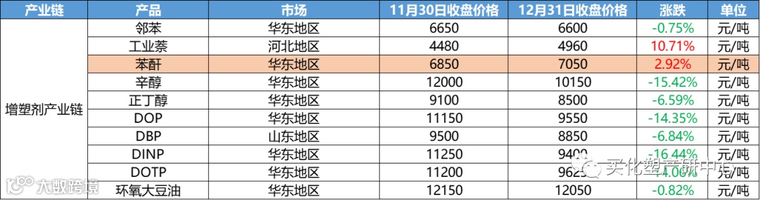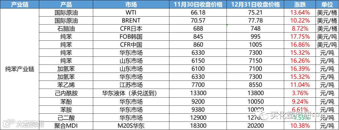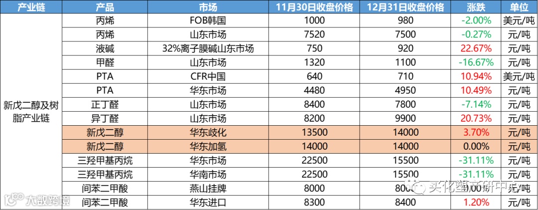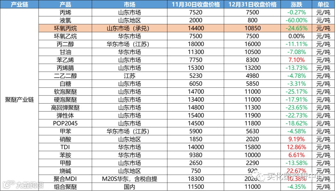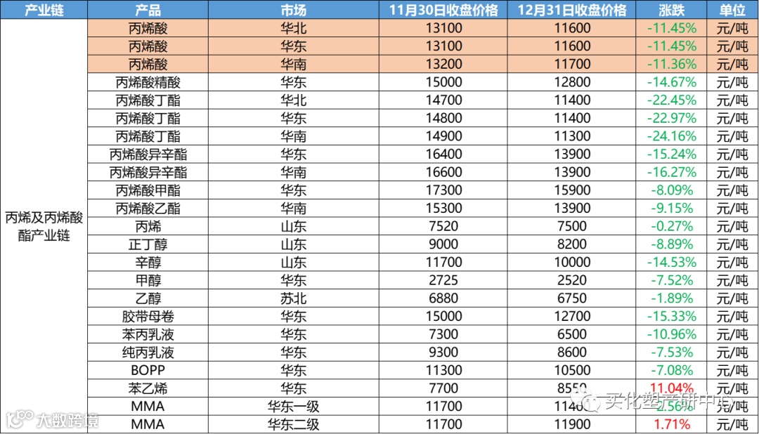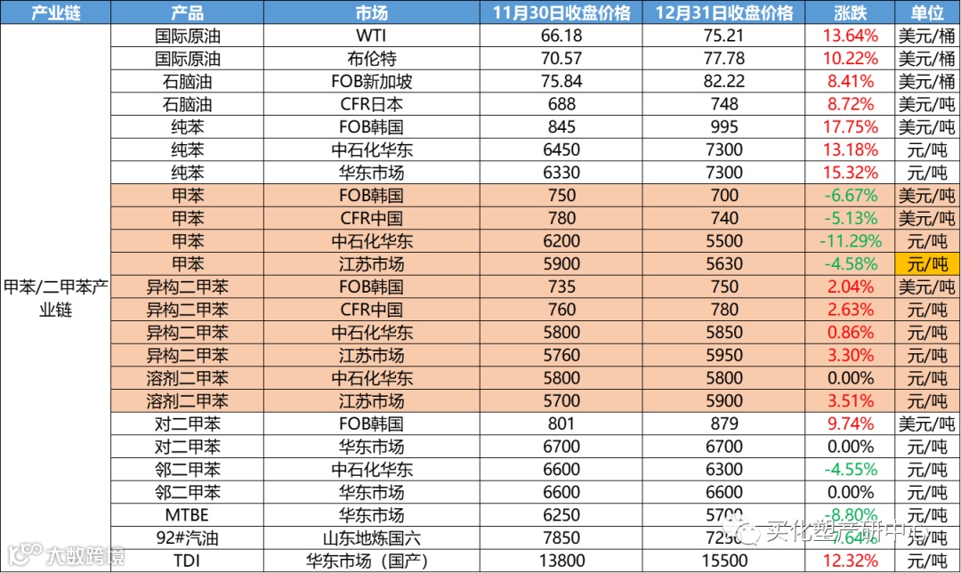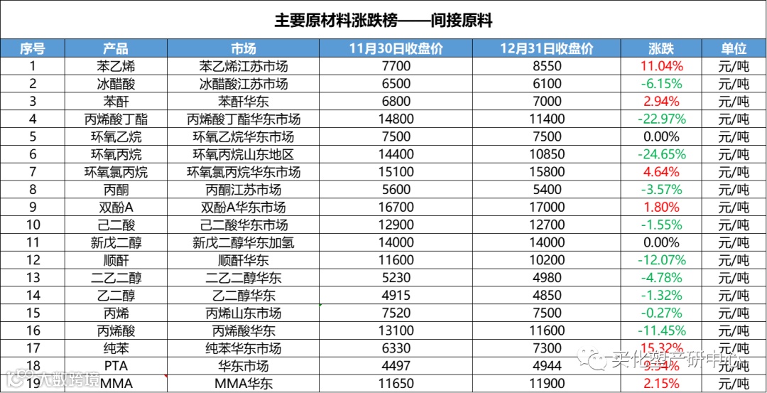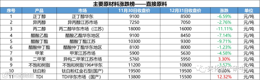 12月涂料原材料市场整体偏震荡,12月化工产品中,跌幅超20%的有20多个产品,涨幅超20%的的仅有其中4个。