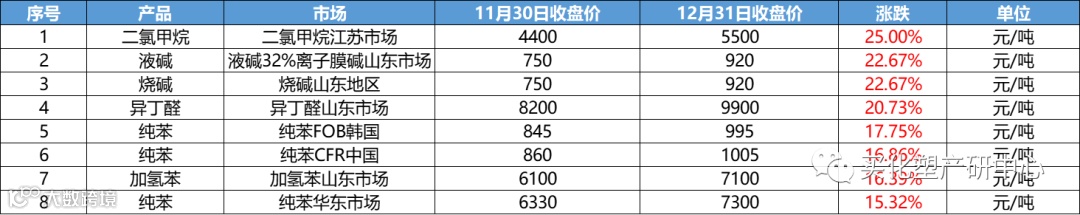 涨幅最大品种是二氯甲烷,上涨幅为25%;其次是烧碱上涨 22.67%;液碱(32%离子膜碱山东市场)上涨22.67%