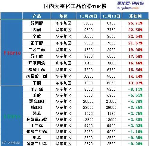 异丙醇、丙酮、辛醇蝉联涨幅榜前三