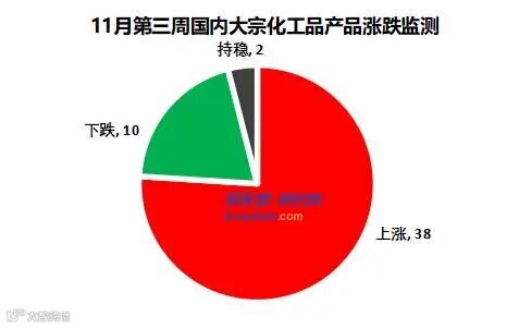 据买化塑研究院监测的50种大宗化工品数据显示,本周上涨品种38个,下跌品种10个,持平产品2个。