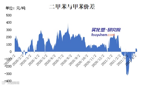 周期也不过维持5-7天,但自2021年2月开始,甲苯价格高于二甲苯价格时间已达近2个月,即二甲苯与甲苯价差出现倒置。