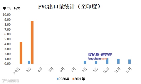 今年由于内外盘存在套利,1-3月中国出口量大涨,出口印度的PVC增长至13.27万吨,较去年同期的0.7万吨大涨1795.71%