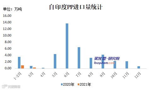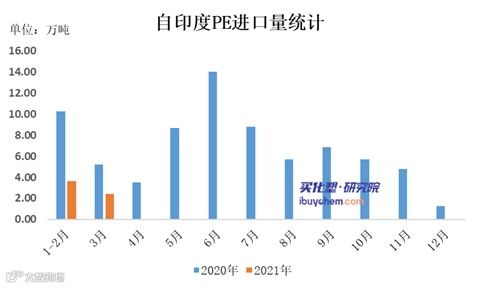 而2021年1-3月自印度PP进口量为1.31万吨,较去年同期4.32万吨减少69.68%。