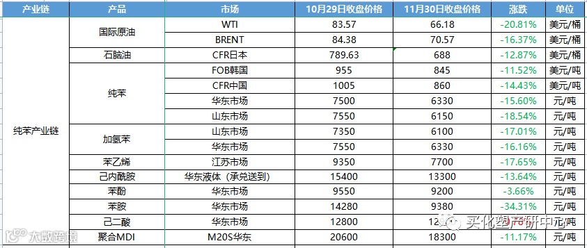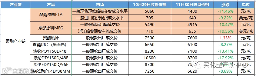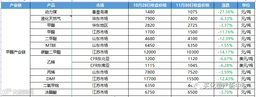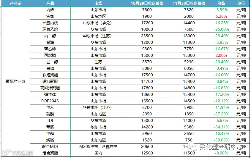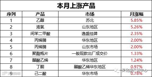 20多个原材料的产业链,涉及一百多个上下游产品中只有9个产品价格上涨,苏北乙醇涨幅最大,+5.85%,其次液氯+5.26%,间苯二甲酸+2.35%。