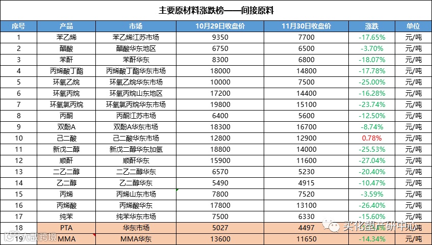 2、主要原材料涨跌榜-间接原料