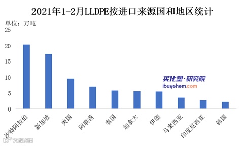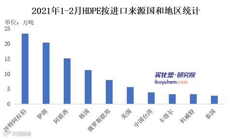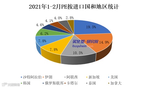 按照PE进口来源国和地区看,排在前三位的分别是沙特、伊朗和阿联酋,进口量占比分别为19.5%、14.9%和10.5%。