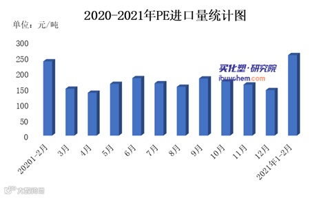 据买化塑研究院【化塑产业链决策系统】跟踪的数据显示,2021年1-2月,国内PE进口量为256.29万吨,同比增长8.37%。按品类来看, LLDPE进口量为92.1万吨,同比增长16.73%,LDPE进口量为54.47万吨,同比增长23.62%,HDPE进口量为109.73万吨,同比下降3.36%。