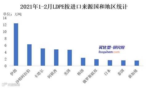分品类来看,LDPE进口来源国和地区排在前三位的分别是伊朗、沙特和卡塔尔。