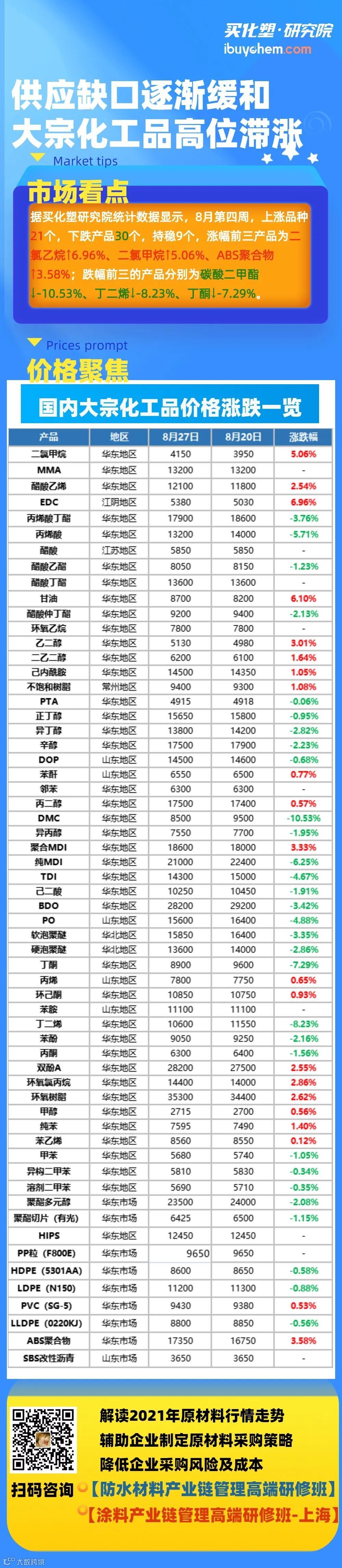 据买化塑研究院统计数据显示,8月第四周,上涨品种21个,下跌产品30个,持稳9个,涨幅前三产品为二氯乙烷↑6.96%、二氯甲烷↑5.06%、ABS聚合物↑3.58%;跌幅前三的产品分别为碳酸二甲酯↓-10.53%、丁二烯↓-8.23%、丁酮↓-7.29%。