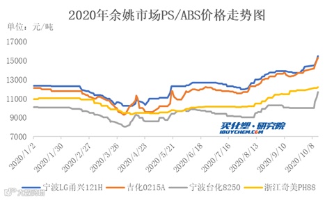 节后,国内塑料市场走势“一片红火”,其中PS和ABS两个品种涨幅更是明显。以余姚市场为例,截至10月13日收盘,121H价格在15500元/吨,较9月底价格上涨1150元/吨,涨幅8%;0215A价格在15300元/吨,上涨1350元/吨,涨幅9.7%;8250价格在11700元/吨,上涨1700元/吨,涨幅17%。