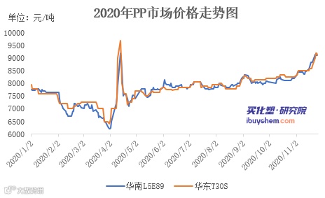 自5月份之后,国内PP市场震荡上行,尤其是10月份后,市场涨势加快,11月份更是出现一波明显拉升。截止到11月27日,华东地区PP拉丝价格在8850-8900元/吨,较10月底上涨约600元/吨,涨幅达7.3%。