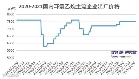 2021年1月环氧乙烷市场价格出现区域性下调,华北地区下调150元/吨至7500元/吨,华中地区下调200元/吨至7500元/吨,东北地区部分下调100元/吨至7450元/吨,华南地区对外执行7450-7500元/吨。