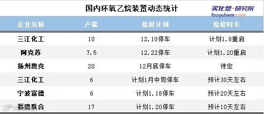 从供应端看节前仍有多套装置停车检修,部分前期低负荷运行的几套装置近期陆续提升开工负荷,但春节前仍有多套环氧乙烷装置正值检修状态或者计划检修,预计后续环氧乙烷市场供应预计增加。