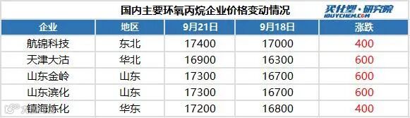 本周一,亨斯迈挂牌价上调,同时公布金陵亨斯迈24万吨/年环氧丙烷装置计划11月1日停车检修,预计为期55天,山东工厂新价续涨至17200-17600元/吨,