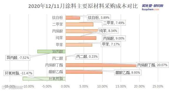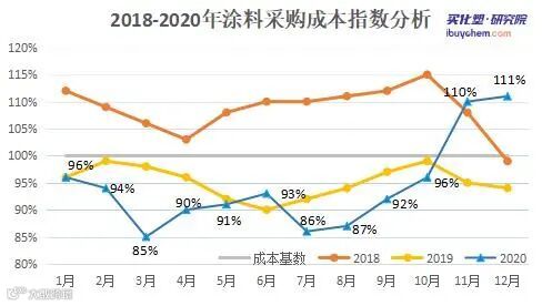 12月,国内涂料采购成本超往年同期,据买化塑研究院涂料采购成本指数显示,2020年12月指数为111%,2018年及2019年同期分别为99%和94%,涂料主要原材料醋酸乙酯、丙烯酸、丙烯酸丁酯、甲苯、纯苯等产品价格上涨,异丙醇及环氧树脂价格下滑。