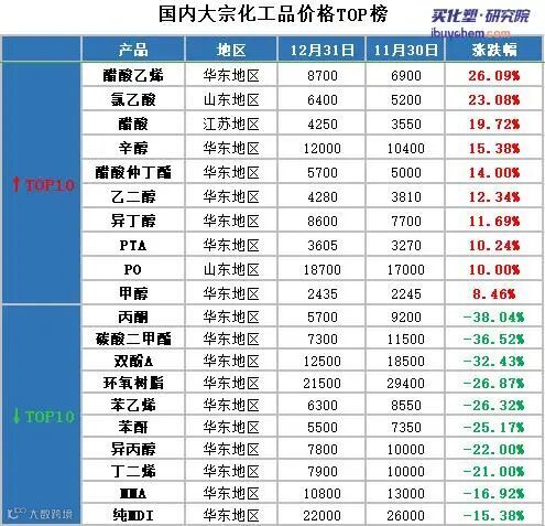 据买化塑研究院监测的50种大宗化工品数据显示,本月上涨品种14个,下跌品种26个,持平产品10个。本周涨幅前三产品分别醋酸乙烯、氯乙酸、醋酸,涨幅分别为26.09%、23.08%、19.72%;跌幅前三的产品分别是丙酮、碳酸二甲酯、双酚A,跌幅分别为-38.04%、-36.52%、-32.43%。