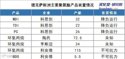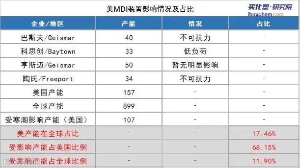 夫40万吨/年MDI装置原料受限、冻损,陶氏34万吨/年MDI装置不可抗力,其中在这次寒潮影响中遭受影响产能约107万吨,占美国产能的68.15%,占全球11.9%。预计受寒潮影响的产能损失,最快也要1个月才能恢复生产。