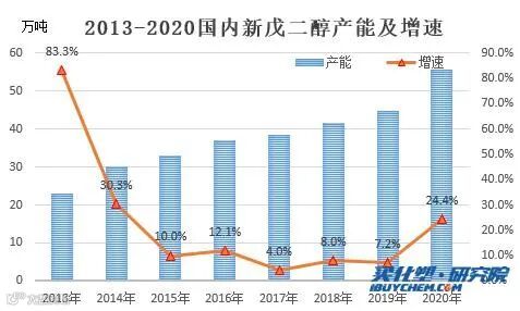 随着我国对粉末涂料和不饱和树脂需求的增长,给新戊二醇的消费量提供了大幅增长空间。近年来,我国新戊二醇产能逐年增长,据统计,2019年我国新戊二醇产能为44.7万吨/年,而预计2020年产能扩张至59.6万吨/年。