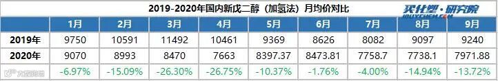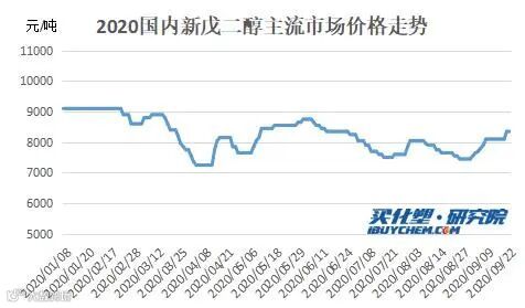 价格方面,2020年以来,受新冠疫情影响,经济发展受到制约,2020年我国新戊二醇均价同比2019年也出现下降,尤其是是3月以及4月这两个月,最高的时候,同比下跌近27%左右。截止至2020年9月份,国内新戊二醇市场价格在8000-8500元/吨,依然低于去年同期。