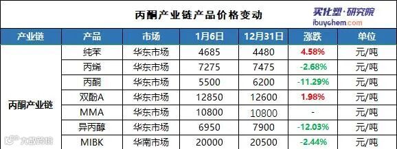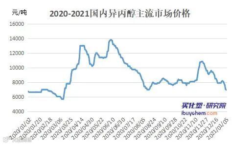 2021年开年第一天,国内丙酮市场价最低暴跌至5050元/吨,虽然当日即可恢复到5250元/吨,但仍超出市场预期。受此丙酮跌势影响,异丙醇今年开门亦走低,截止到1月6日收市之即,山东地区市场跌至6650元/吨,江浙地区跌至6950元/吨左右。