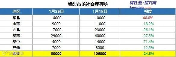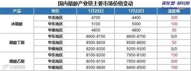 截止至1月25日收市,华东地区冰醋酸价格涨至5100-5300元/吨,华南地区冰醋酸价格涨至4800-4850元/吨,华北地区冰醋酸价格涨至4700-4750元/吨。