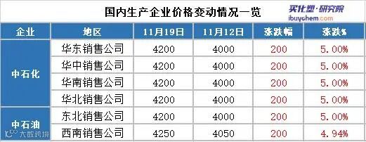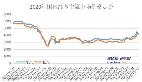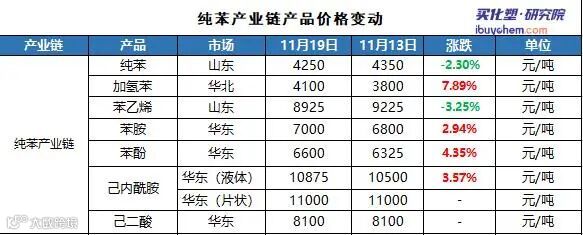 本周,国内纯苯价格先涨后跌。截止11月19日,华东主流市场价格在4090-4300元/吨,山东地区主流市场价格在4220-4250元/吨。