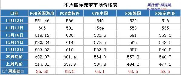 海湾收609.03美元/吨。与上周11月11日相比,FOB韩国涨39美元/吨,CFR中国涨39.5美元/吨,FOB鹿特丹涨72美元/吨,FOB美国海湾涨63.63美元/吨。