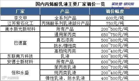 导读:丙烯酸乳液受主要原材料上行影响,生产企业发布调价函,涨幅在200-800元/吨