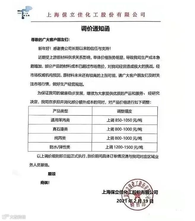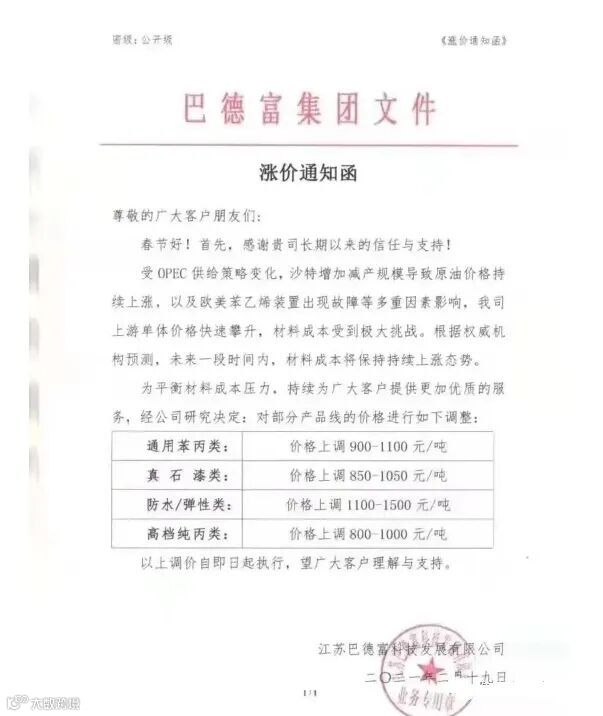 据目前了解,巴德富、保立佳等国内主流乳液厂商纷纷发布涨价通知,对包括防水乳液在内的产品提价。