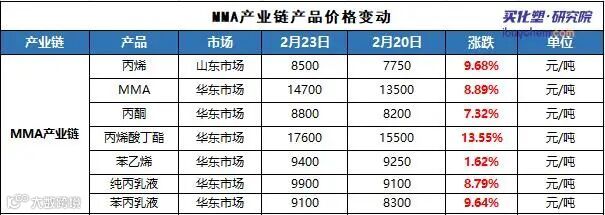 节后,国内MMA市场大幅上涨,价格不断刷新,截止至2月23日收市,华东市场价格涨至14700元/吨,三个工作日涨幅达到1500元/吨以,其相关产业链产品悉数上涨,原料上涨致使ACR工厂承压,下游产品丙烯酸乳液、ACR价格连连走高。