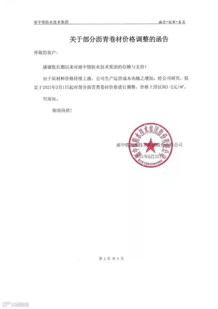 由于原材料价格持续上涨,涂料企业也开启调价模式,雨中情防水宣布将于2021年3月1日起对部分沥青类卷材价格进行调整,价格上浮区间1-2元/㎡。