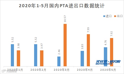 2020年1-5月我国PTA进口量整体在22.1万吨左右,与去年同期相比,进口量增加约15.1万吨左右。随着第三季度恒力第五套250万吨装置等新装置投入生产,国内PTA产能将进一步提升,预计后期PTA进口量会持续降低。