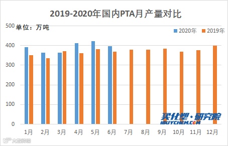 从产量数据来看,2020年1-6月累计产量2349.8万吨,而2019年上半年产量2168.05万吨,伴随着产能及开工率的提升,2020年上半年PTA产量也呈现增加趋势。