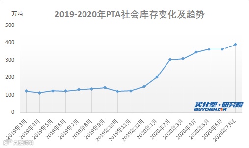 我国PTA社会库存从2019年10月份开始逐步呈现增加趋势。库存量从2019年10月份121万吨攀升至2020年6月364万吨,累库趋势明显。而随着7月份PTA新装置投产增量,市场供应量呈现高位,但终端需求表现持续不佳,或将对聚酯形成负反馈,在需求增速跟不上供应增速的情况下,预计7月PTA供需累库将超26万吨,社会库存或高达390万吨。