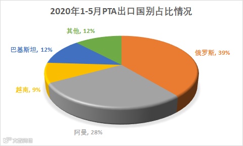 2020年1-5月我国PTA出口总量在33.5万吨左右,较去年同期34.4万吨的进口量下降-2.6%。主要出口国家依旧是