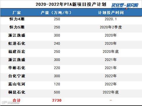 据买化塑研究院数据显示,2020-2022年国内PTA预计新增产能达2730万吨/年,其中57%产能为涉及炼化一体化PTA大厂扩能。