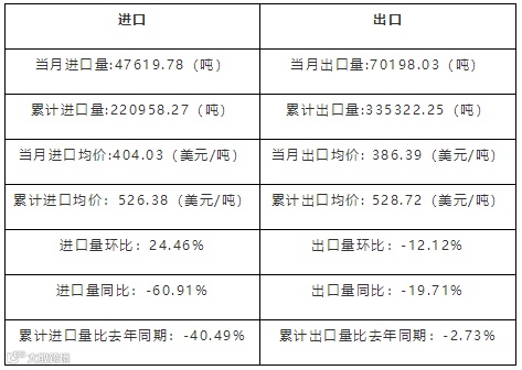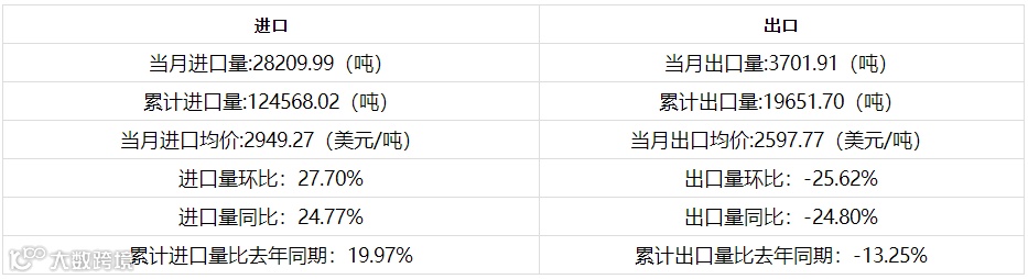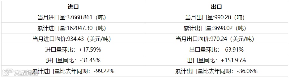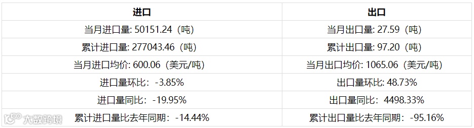 | 累计进口量比去年同期:-46.73% | 累计出口量比去年同期:-66.38% |