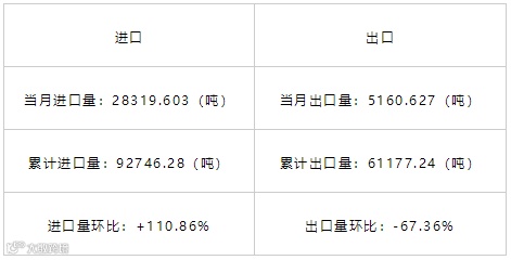 | 累计进口量比去年同期:-64.78% | 累计出口量比去年同期:357.78% |