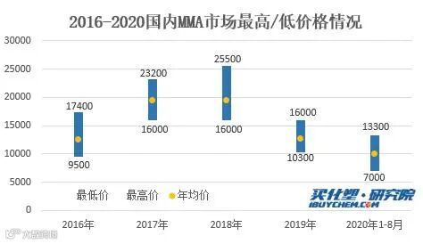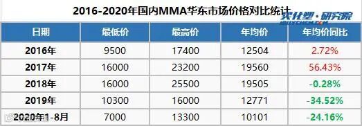 从近5年价格走势情况来看,2020年开年国内MMA市场价格大幅下跌,尤其在4月达到年内最低,甚至近5年最低点7000元/吨。二季度上游原料丙酮走势强劲,成本推动下,MMA市场价格有所上行,但年均价依然低于往年,据买化塑研究院统计数据显示,2020年1-8月国内MMA华东市场均价为10101元/吨,较2019年均价下滑-24.16%。年最高价格为13300元/吨。