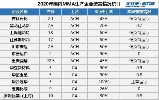 据买化塑研究院数据显示,2020年8月国内MMA生产企业平均开工率在66%附近,较上月开工率有所提升。进入9月吉林石化20万吨/年MMA装置及上海璐彩特18万吨/年MMA 装置装置低负荷运行,同时惠菱化成9万吨/年MMA装置面临停车检修,预计持续一个月左右,预计9月份国内MMA装置开工将出现下滑。