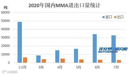 据最新的进出口数据显示,2020年7月MMA进口量环比比减少3.85%,出口量环比减少-7.95%。2020年MMA出口量较去年有所减少,去年开始贸易摩擦不断,加之进入2020年国际环境严峻,出口形势偏弱,1-7月出口量整体较去年减少。就1-7来看,出口量在2.70万吨。其中据海关统计, 2020年7月我国甲基丙烯酸酯当月出口量为3341.77吨,累计出口量为26971.72吨,当月出口金额为646.05万美元,累计出口金额为6160.9万美元,当月出口均价为1933.26美元/吨,出口量环比下跌7.95%,出口量同比下跌19.63%,累计出口量比去年同期下跌21.09%。