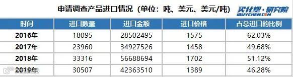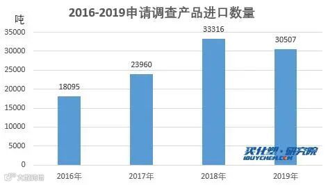 据数据显示,2016至2019年期间,申请调查产品(乙二醇和丙二醇的单烷基醚)进口数量大量增加。2016年的进口量为1.8万吨,2017年增至2.4万吨,此后2018年和2019年都超过了3万吨。四年期间的累计增长幅度达到68.59%。