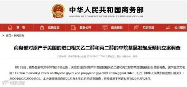 8月31日,商务部发布2020年第36号公告,决定即日起对原产于美国的相关乙二醇和丙二醇的单烷基醚进行反倾销调查。该产品英文名称:Certain monoalkyl ethers of ethylene glycol and propylene glycol或Certain glycol ehter,归在《中华人民共和国进出口税则》:29094400和29094990。本次调查通常应在2021年8月31日前结束调查,特殊情况下可延长至2022年2月28日。